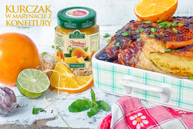 Z soku i skórki startej z pomarańczy oraz konfitury, sosu sojowego oraz przeciśniętego przez praskę czosnku sporządzamy marynatę mieszając dokładnie te składniki. Marynatą nacieramy kurczaka i odstawiamy w chłodne miejsce na godzinę. Po tym czasie pod skórę kurczaka wkładamy kawałki masła, mięso układamy w naczyniu żaroodpornym, przykrywamy i pieczemy w piekarniku rozgrzanym do 180 st. C. Czas pieczenia należy uzależnić od wagi kurczaka. Około 1,5 kg kurczaka pieczemy zwykle niecałe 2 godziny. Na ostatnie pół godziny ściągamy przykrycie i pozwalamy skórce apetycznie się zezłocić.